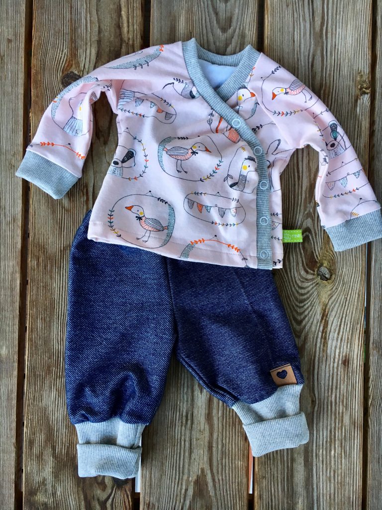 Ich bin wieder Tante geworden und so hatte ich die Chance, wieder mal ein Erstlingsset zu nähen. Ich habe mich für ein Wickelshirt und eine kleine Pumphose entschieden: